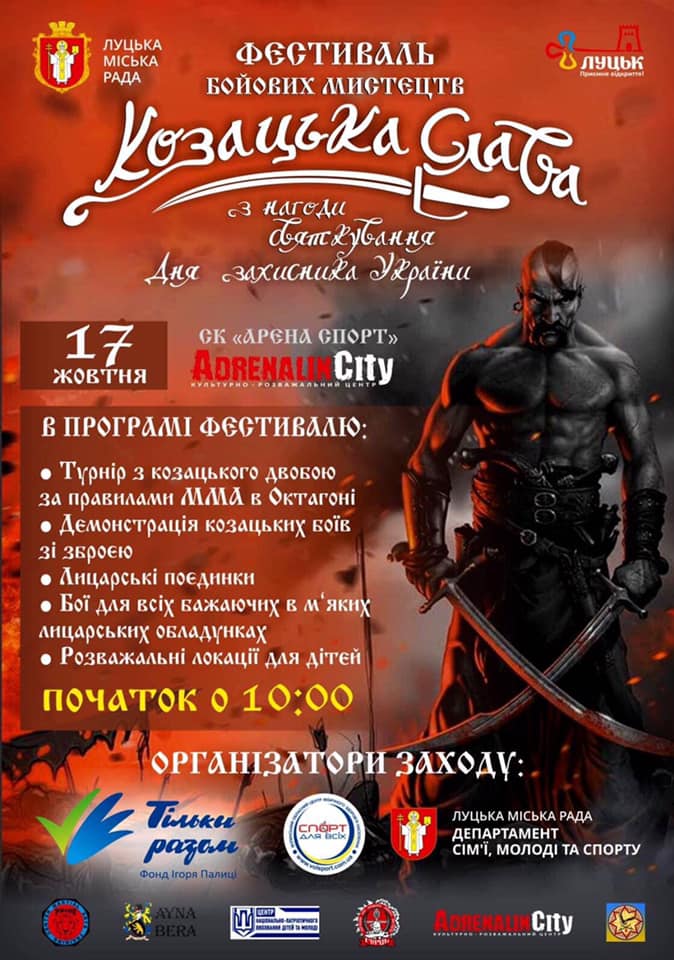 17 жовтня (субота) на базі Культурно-розважального комплексу «Адреналін-Сіті» відбудеться грандіозний Фестиваль бойових мистецтв «Козацька Слава».
