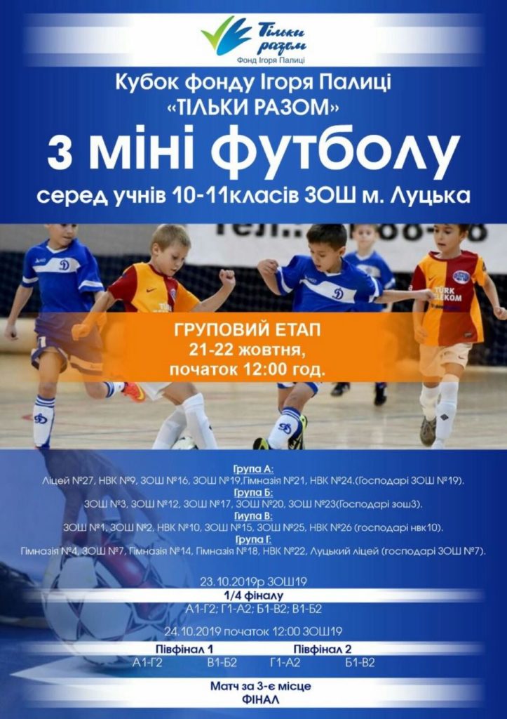 21-22 жовтня у Луцьку розіграють Кубок Фонду Ігоря Палиці «Тільки разом» з мініфутболу серед учнів 10-11 класів. Участь у турнірі братимуть 23 навчальні заклади обласного центру.