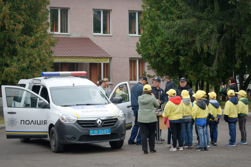 Та чи не найбільша юрба була біля машини поліцейських. Воно й не дивно, адже до школярів завітали не тільки інспектори, а й справжній криміналіст! Він прихопив свою валізку з обладнанням, тож дітлахи мали нагоду спробувати зняти відбитки пальців.