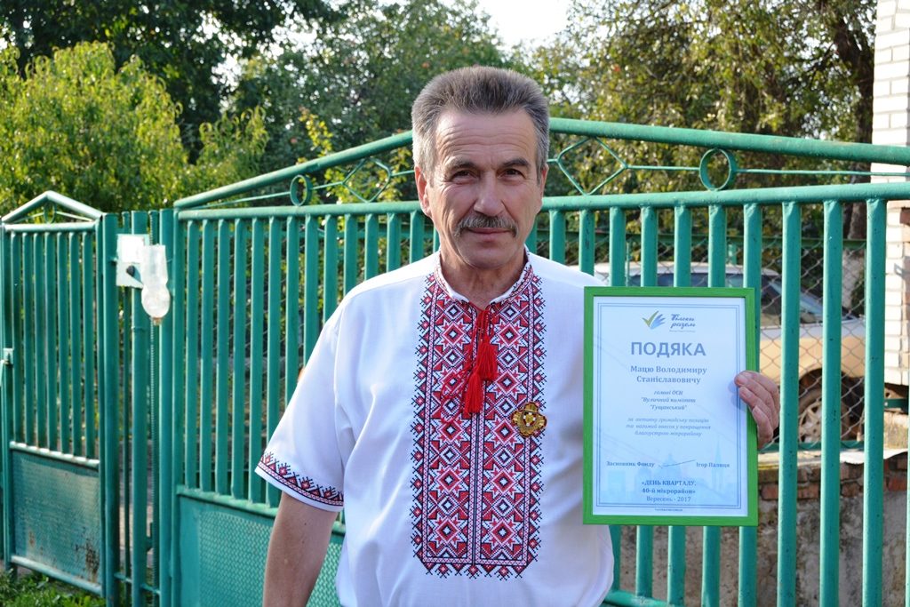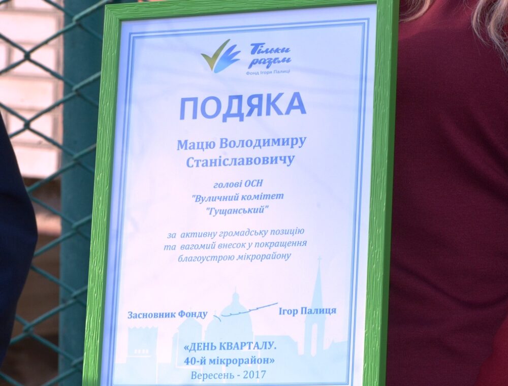 Днями представник Фонду Ігоря Палиці «Тільки разом» Олена Оліфірович вручила Володимиру Мацю подяку за активну громадську позицію та вагомий внесок у покращення благоустрою мікрорайону.