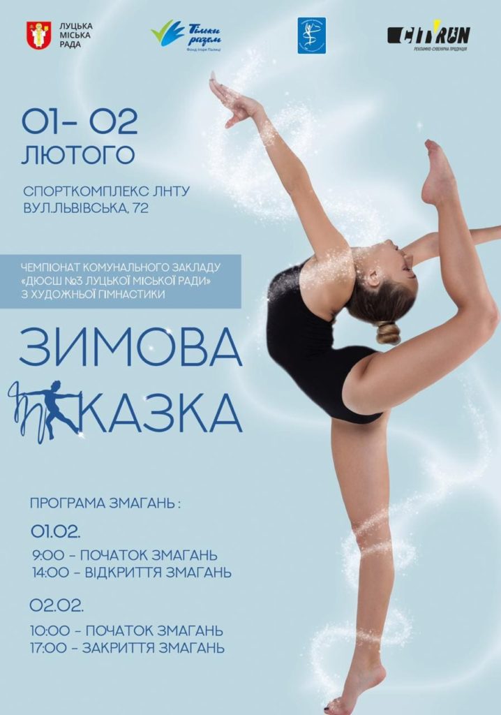 У спорткомплексі Луцького національного технічного університету (вул. Львівська, 72) 1-2 лютого відбудеться Чемпіонат КЗ “ДЮСШ №3 Луцької міської ради” з художньої гімнастики “Зимова казка”.