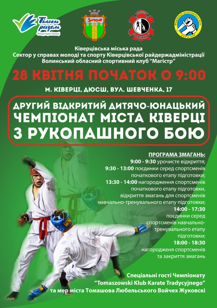 28 квітня у Ківерцівській дитячо-юнацькій спортивній школі відбудеться другий відкритий чемпіонат міста Ківерці з рукопашного бою. Організаторами заходу є Волинський обласний спортивний клуб «Магістр».